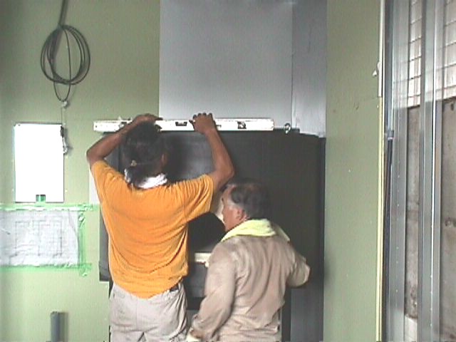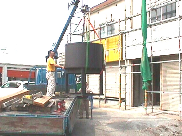 ユニック車で吊り降ろし、架台と本体をドッキングさせる。 |