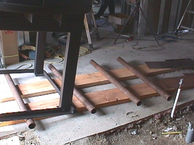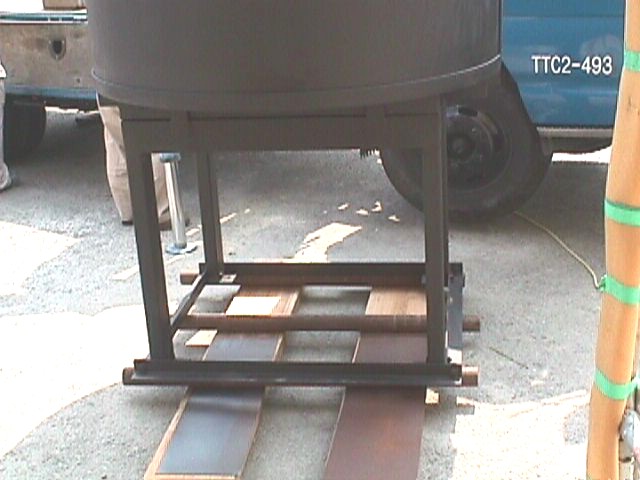 道板の上にコロ(単管パイプ等)を置き、その上に架台と本体を乗せる。 |